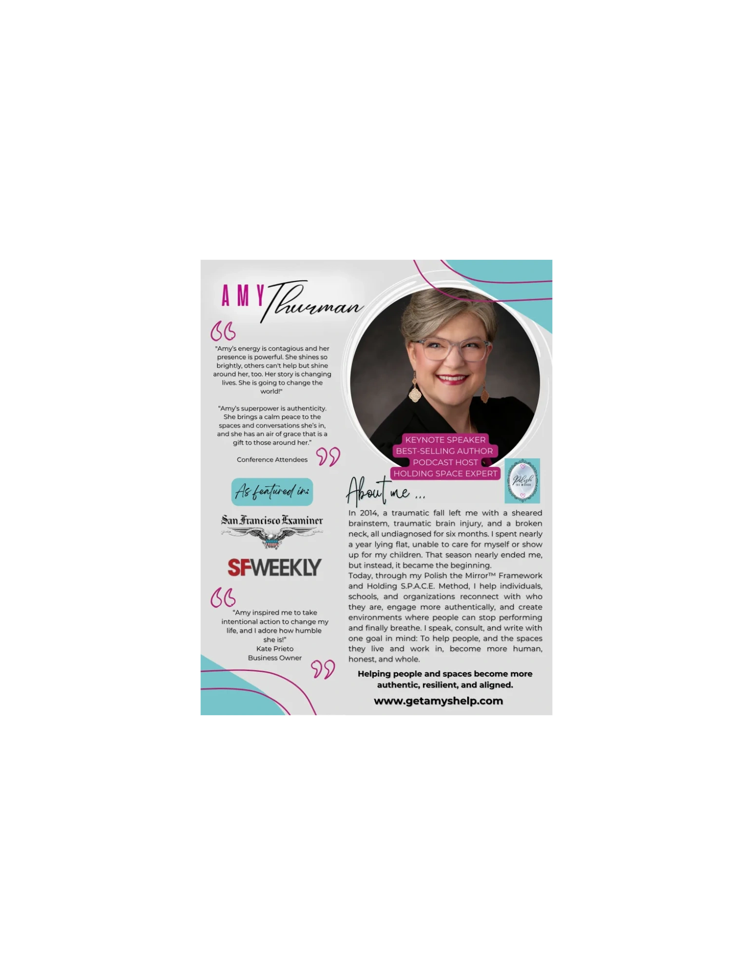 Amy Thurman is a best-selling author, keynote speaker, and a thought leader on the transformative power of authenticity and holding space. After living 10 years with a broken neck that went undiagnosed for six months, she was forced to redefine everything, including what it means to be strong. She discovered that true strength isn't found in pretending to be okay, it's found in presence, softness and the courage to be real.